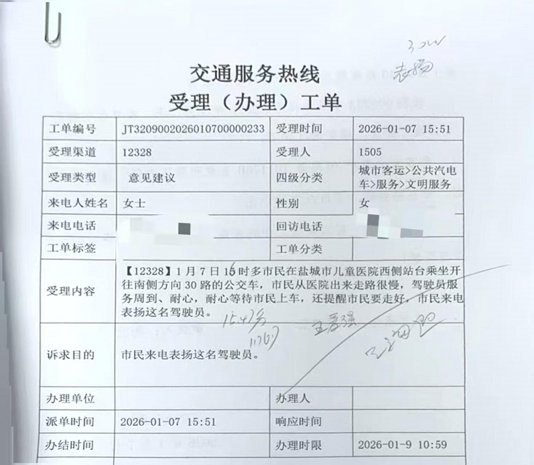 近日,二分公司连续收到来自12345、12328热线的实名表扬工单,多位市民专门来电,点赞驾驶员主动帮扶乘客的暖心服务,展现了盐城公交的文明风采与社会担当。