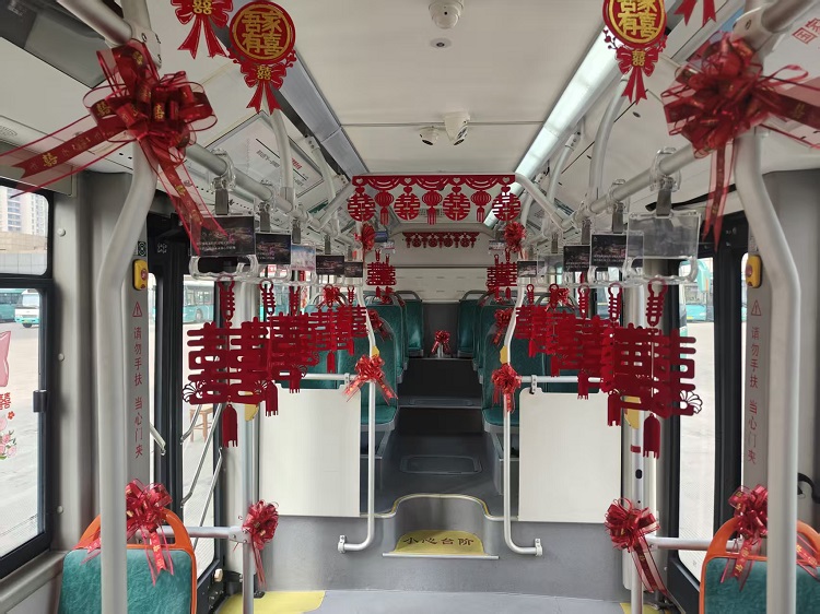 走进车厢,喜庆氛围更显浓郁。车顶垂挂的红色拉花、车门张贴的大红字,每一处细节都透着新人的用心。据了解,这些布置均由新郎新娘共同设计并亲手装扮,“一针一线”里都藏着对未来生活的美好期许。