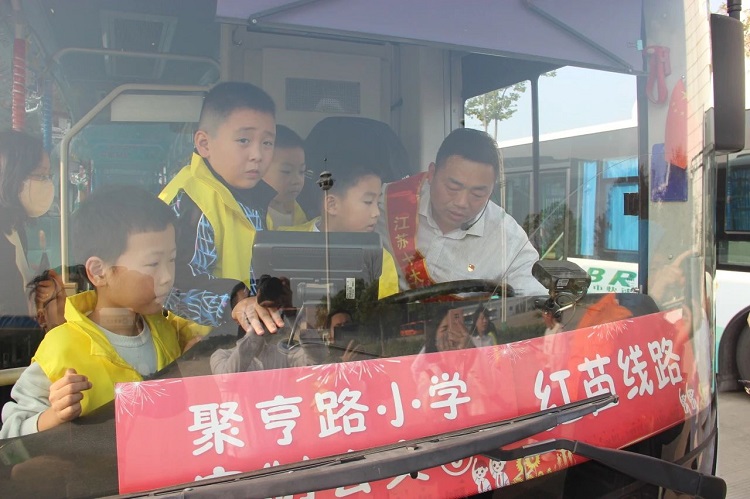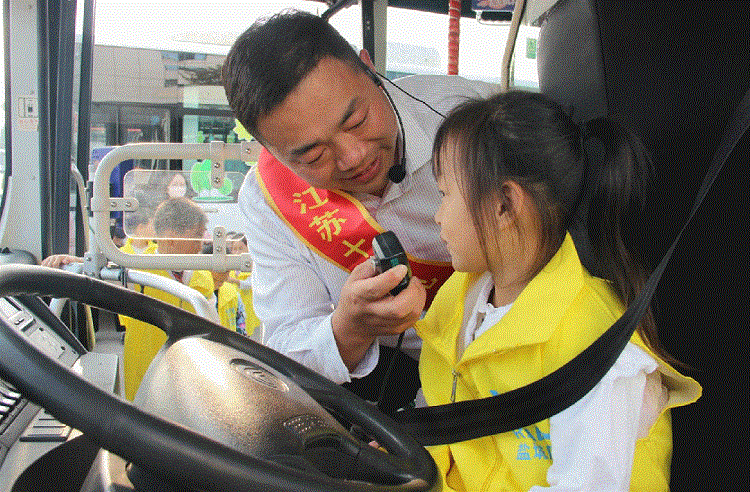 在公交车内,在江苏十大见义勇为好司机金嵘的示范和指导下,小记者们轮番扮演公交驾驶员,他们坐到驾驶位上,亲身体验公交司机的日常工作场景,仔细观察公交车盲区,拿起呼叫器喊出自己想对乘客说出的话。