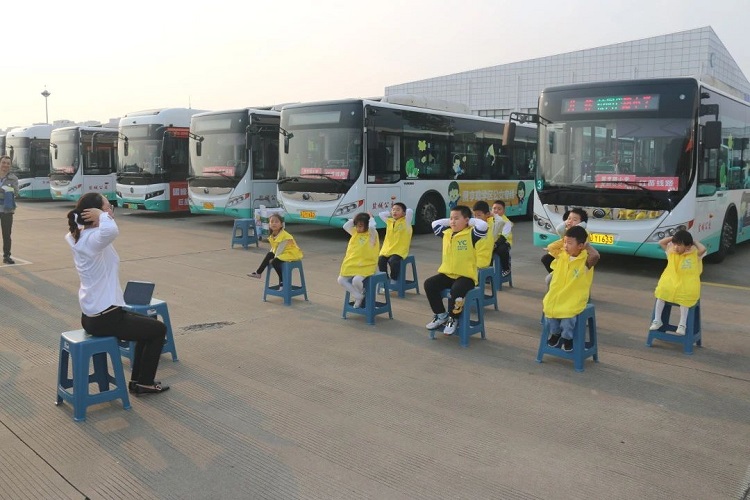 “小小驾驶员”体验结束后,工作人员带领小记者们做起来抗疲劳操放松肩颈,让家长和孩子们更能理解到公交驾驶员工作的不易。