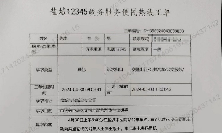 4月30日,市公交公司接到一份来自12345转来的表扬工单,对60路驾驶员武国平向弱势群体伸出援手提出表扬。