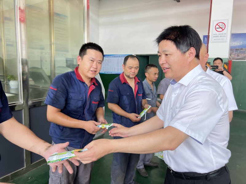 在修理车间里,夏建龙与修理工人们一一握手交谈,详细了解他们工作生活以及防暑降温工作落实情况,随后向修理工人们送上防暑降温用品,感谢他们在炎炎夏日里的付出,对他们不畏酷暑、守岗敬业的工作作风表示肯定,叮嘱他们要做好自身防护,注意防暑降温,平稳顺利地度过高“烤”。