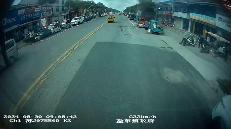 8月30日上午9时8分许,K2线驾驶员杨银刚像往常一样驾车执行运营任务,途经盐东镇政府站台附近时,发现前方一辆停放在路边的电动三轮车正在猛烈燃烧并伴有大量浓烟。车主夏先生正试图用水扑救,但效果并不明显。眼看火情就要殃及周边的多辆电动三轮车,情况十分危急。
