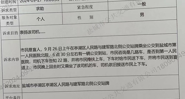 无独有偶,9月26日,22路驾驶员王斯国在营运过程中,也遇到了类似情况。当天早上6时39分,王师傅行驶至人民路解放路口站时,看到一位盲人乘客在站台上试探徘徊着想上前乘车。王师傅见状,立刻起身,快速走向这位乘客,用双手小心翼翼地搀扶他上车,并细心地为其寻找一个既安全又舒适的座位。待其到达目的地,王师傅再次小心搀扶帮其下车,并引导他走上盲道后才回到驾驶室继续执行营运任务。