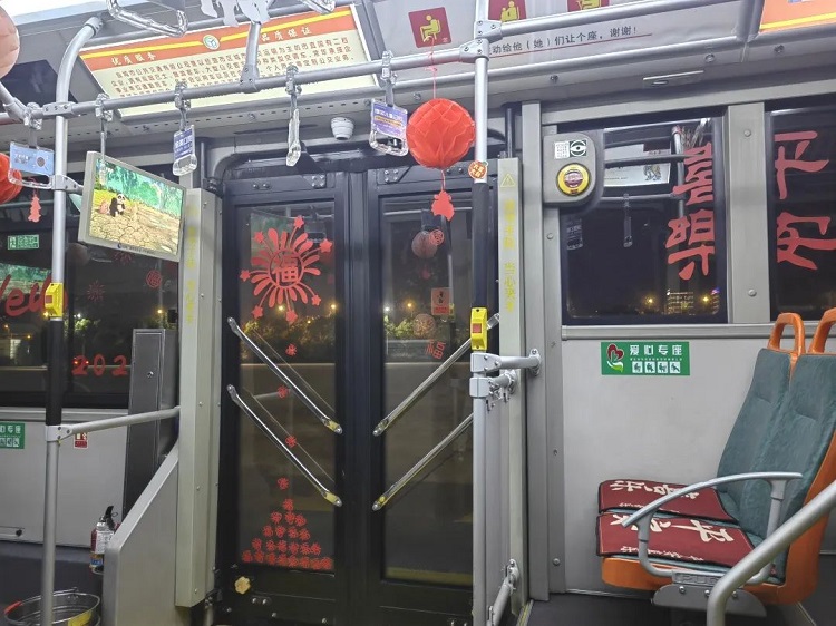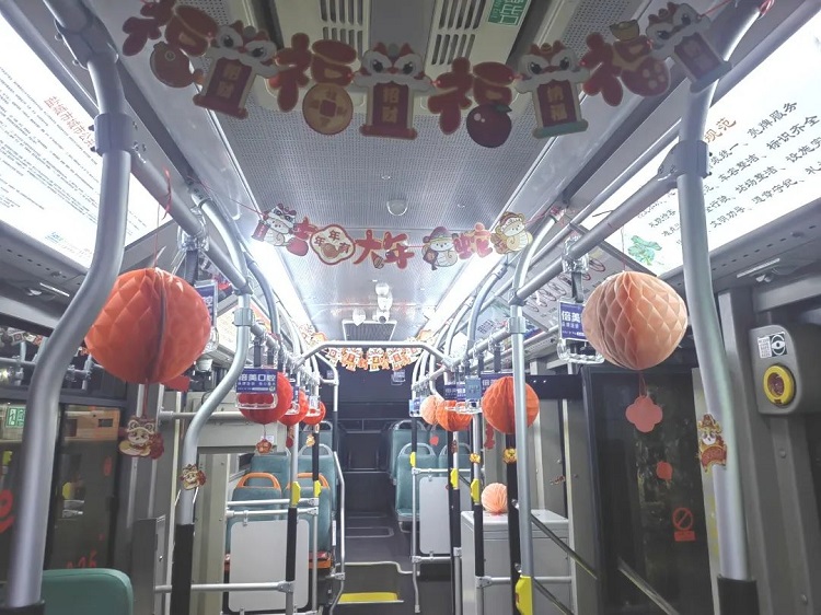 1月1日5点30分,B1线首班车装扮喜庆开启了蛇年的第一天,平安喜乐的贴纸,金蛇送福的漂亮窗花,穿成串儿的红灯笼,爱心座椅上红彤彤的棉花坐垫,让原本简单的车厢瞬间充满了浓浓的节日气息。年味车厢传递着公交人美好的祝福,更让乘客一上车就感受到浓浓的温馨!一位登上首发车的乘客高兴地说:“一上车就感受到了新年的氛围,让人心情格外好。”