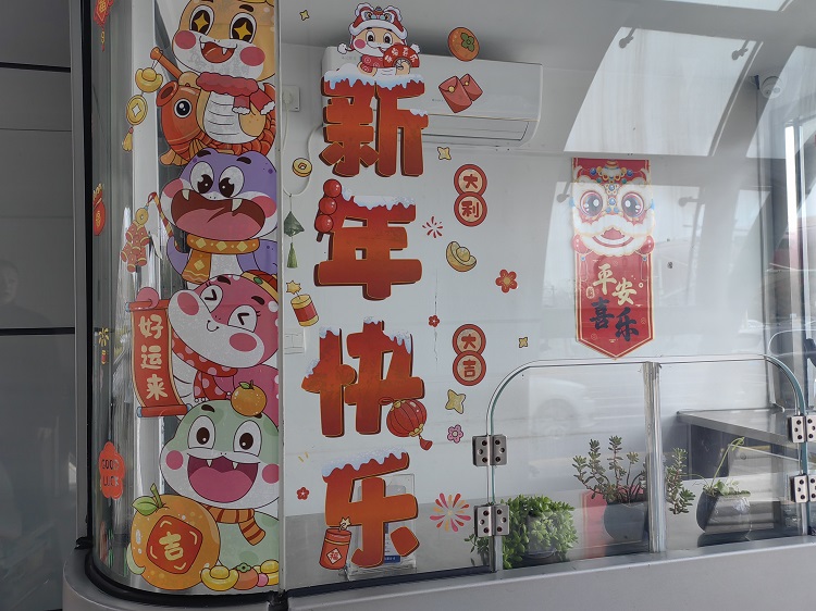 大扫除活动刚结束,“迎新春”装扮行动紧接着拉开帷幕。在公交站台,大家默契配合,悬挂中国结、布置福字装饰,将原本普通的站台装点得年味十足。与此同时,公交车上的装饰工作也在火热进行。大家在车厢拉手上挂上小巧的红灯笼,车窗贴上红艳的新年窗花,让乘客一上车就能感受到扑面而来的新春气息。B1线周师傅笑着说:“看到这些装饰,自己心里都暖洋洋的,希望乘客们也能有个好心情。”