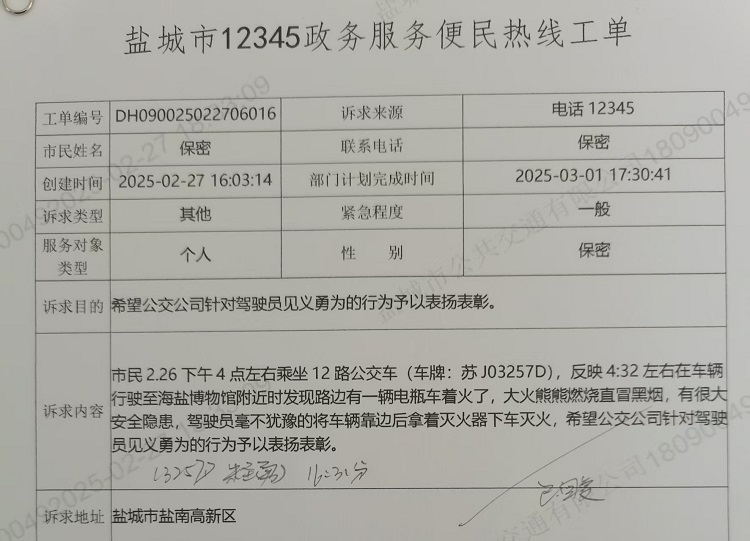 近日,二分公司收到了一件来自12345市民服务热线的表扬工单,对12路驾驶员朱圣勇在遇到电瓶车着火时的英勇救火行为表示高度赞扬。
