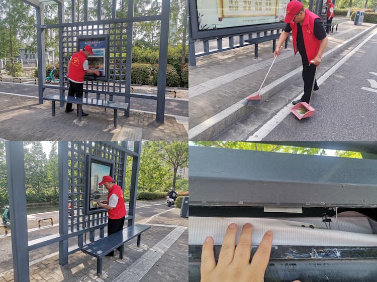 活动现场,志愿者们分工明确、配合默契。他们细致擦拭公交站台的站牌玻璃及金属边框,针对广告栏、等候椅等区域进行深度清洁,不放过任何一个角落的灰尘与污渍。经过数小时的辛勤付出,站台玻璃透亮如新,设施整洁清爽,候车环境显著提升。在清洁过程中,志愿者们不仅注重环境整洁,更主动排查安全隐患。在检查过程中发现学海路人民路口站台橱窗玻璃存在松动脱落风险时,志愿者第一时间拍照记录,并立即向公司运维部门反馈问题。此外,志愿者们还主动向候车市民宣传文明乘车理念,引导大家爱护公共设施,共同维护城市“窗口”形象。