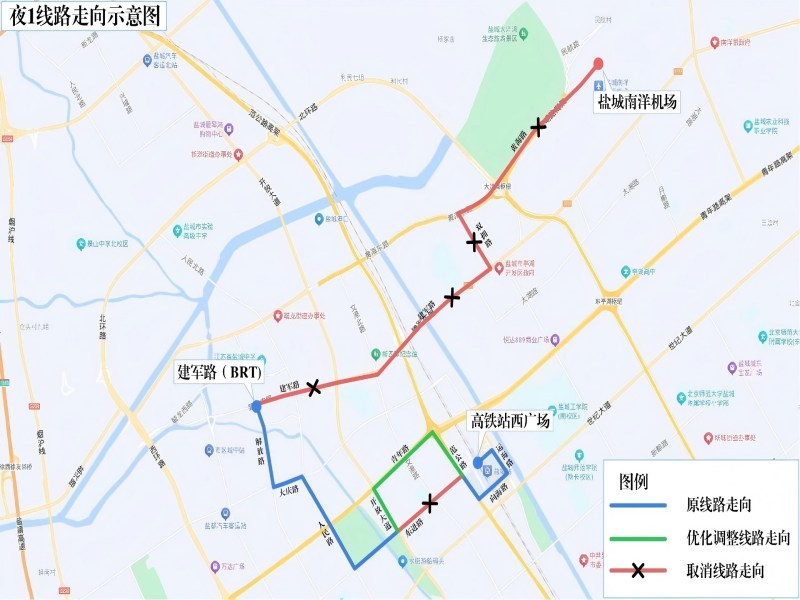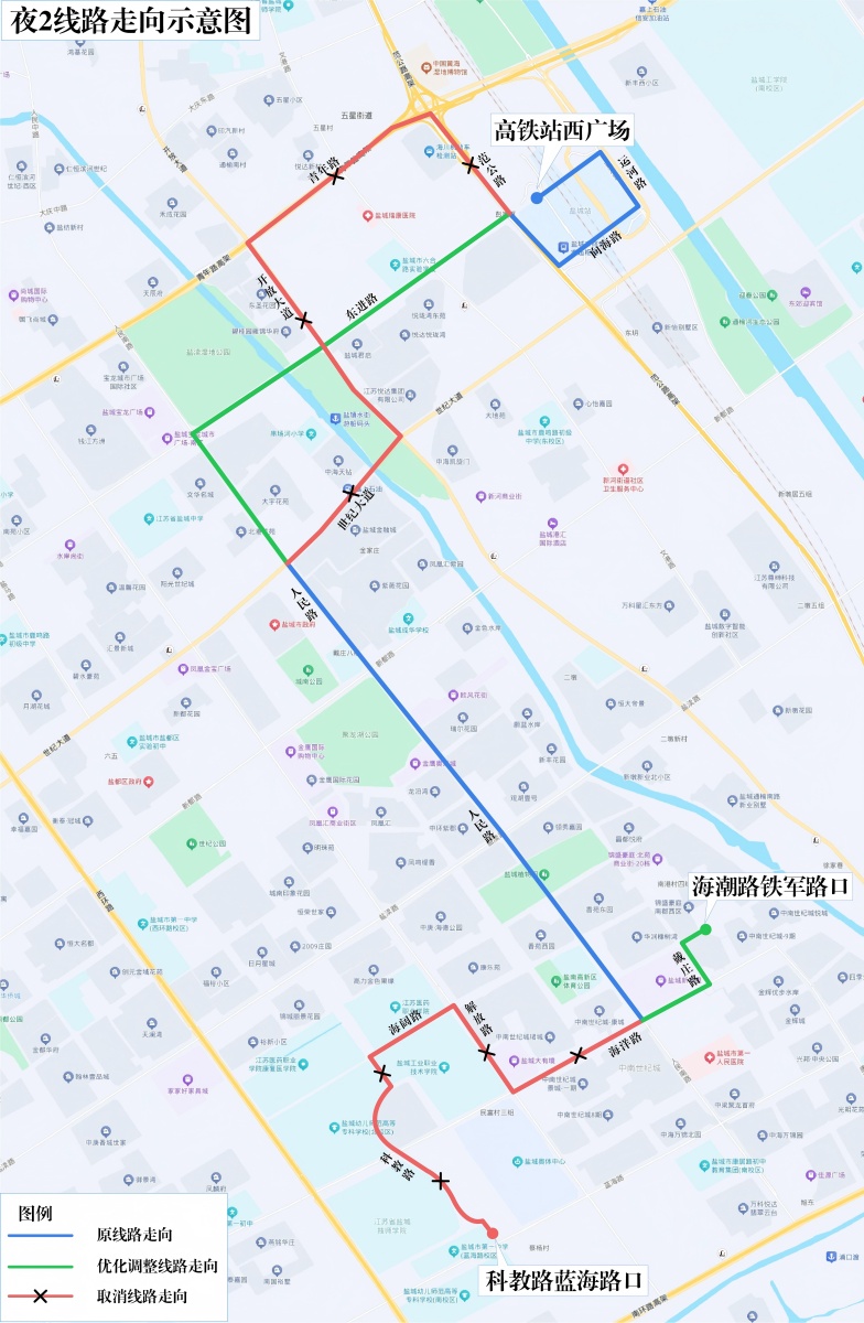 为进一步优化公交线网布局,提升整体运营效能,更好的方便市民出行,盐城公交于6月13日优化夜1、夜2线,执行准点公交模式,并延长B3线运营时间至21:00,具体如下: