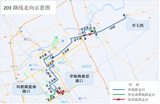 不再停靠站点:富民市场(路南)、建军路蓝宝路口、环保科技城(路北)、人民路纳海路口、蓝海路人民路口、戴庄路蓝海路口、学海路人民路口、光明西苑、光明东苑、学海路康居路口。