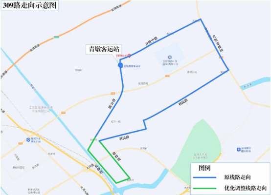 调整后走向:青墩客运站、盐青路、盐特线、利民路、青墩连接线、盐特路、青墩中路、盐青路、青墩客运站。