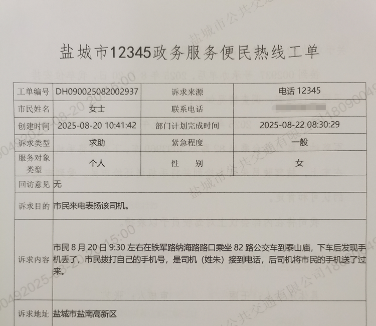 8月20日上午9点30分左右,市民陶女士在铁军路纳海路路口乘坐82路公交车前往泰山庙。下车后,陶女士发现自己的手机不慎遗失在车厢内,随即拨打自己的手机号尝试寻找。该车驾驶员朱荣丰师傅在车辆到达公交站点停靠时,成功接听了陶女士再次打来的电话。朱师傅当即告知陶女士手机已被妥善保管,并与其约定在泰山庙站台交还。陶女士取回失物后,深受感动,特意拨打了12345热线,对朱师傅拾金不昧、急乘客所急的服务态度提出表扬。