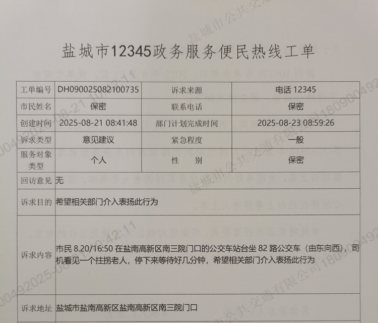 无独有偶,就在同一天的16点50分,另一位82路驾驶员刘建根师傅在运营途中也展现了高度的职业素养。当时车辆停靠新都路解放路口站台,刘师傅注意到一位拄双拐的女士正急切地向公交车方向挪动步伐。虽然信号灯已转为绿灯,但考虑到该乘客行动不便且赶车心切,刘师傅在确保安全的前提下,耐心地在原地等待。这一充满人情味的举动,恰好被一位热心市民目睹。该市民被刘师傅主动关怀特殊乘客的行为所感动,也随即拨打了12345热线,对他的暖心服务给予了高度评价。