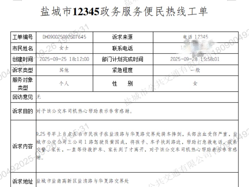 9月27日,市公交公司收到12345热线转来的一则表扬工单,市民董女士对1路公交车驾驶员黄国成在雨中搀扶其孩子上车避险并实施紧急救助的暖心善举给予了高度赞扬。