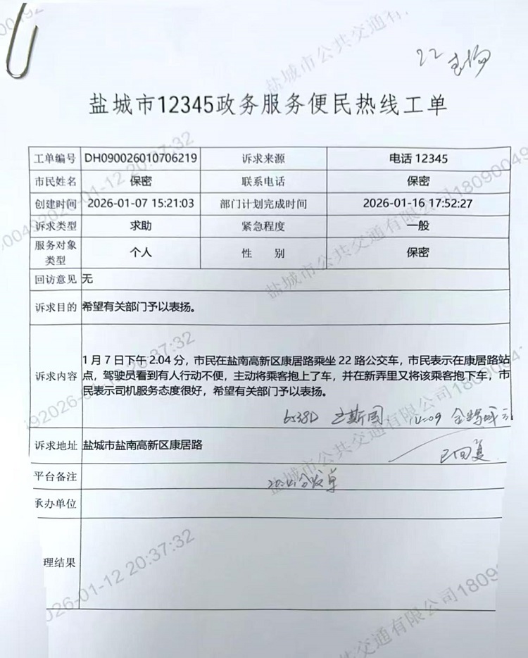 近日,二分公司连续收到来自12345、12328热线的实名表扬工单,多位市民专门来电,点赞驾驶员主动帮扶乘客的暖心服务,展现了盐城公交的文明风采与社会担当。