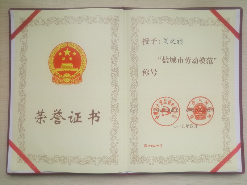 我司刘之祯荣获“盐城市劳动模范”称号