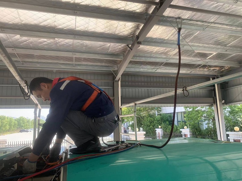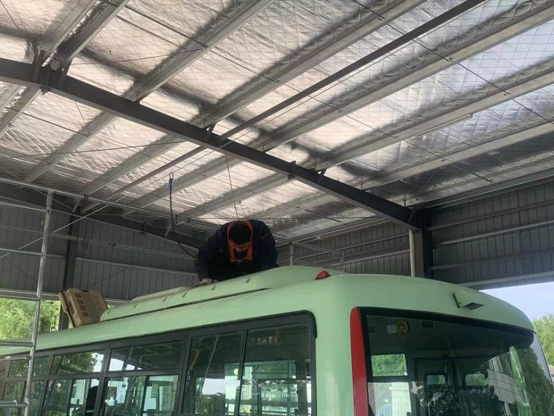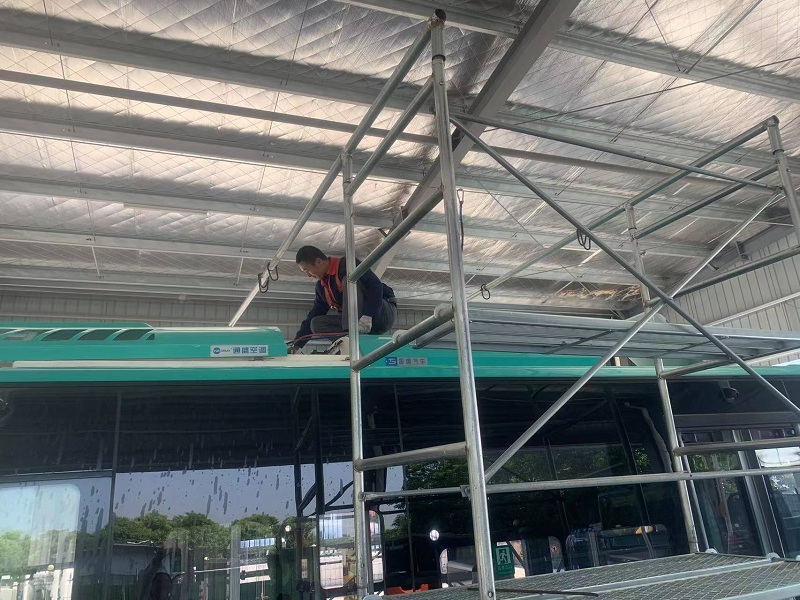 为了保证夏季公交车辆空调的正常使用,近期,公交修理分公司组织人员对所有车辆的空调系统进行专项排查检修。由于公交车辆空调大部分都在车辆的顶部,给维修工作带来很大困难。维修人员需要做好充分安全防护,才能有效对车辆空调进行检修。在修理分公司空调专项维保场地上,修理人员必须佩戴好高空作业专用安全绳,登上安全作业架,在充分保障维修人员安全的情况下进行空调维保工作。