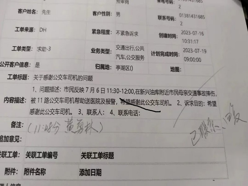 近日,市公交公司接到市长热线转来的表扬工单,市民徐其国在来电中表扬了11路驾驶员热心助人,将交通事故伤者送医救治的义举。