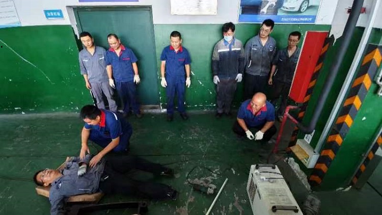 演练中,修理工突然触电倒地,修理班长发现后,立即大声呼救,并第一时间迅速切断电源,让触电人员彻底与电流断开,防止事故危害扩大。随后修理班长拨打120急救电话, 随即采取“心脏胸外挤压法”和“人工呼吸法”对触电人员进行急救,触电人员经抢救终于恢复心跳和呼吸。恢复心跳和呼吸后,为防止继发休克或心衰,让触电人员保持平躺姿势观察其精神状态,等待救护车到来。