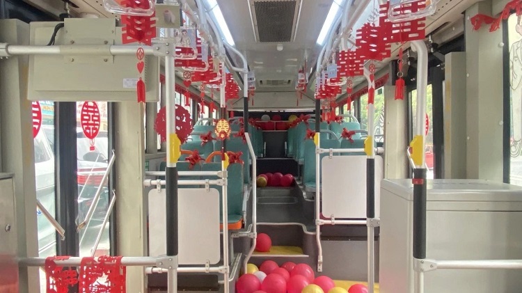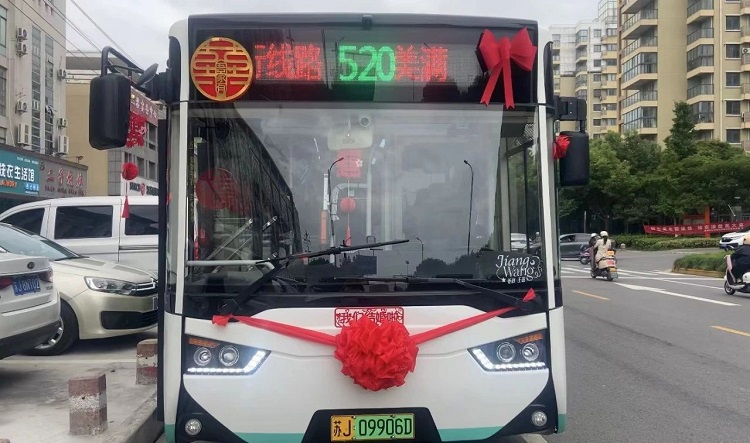 公交“婚车”简约而时尚、喜庆而浪漫,引领绿色低碳新潮流,载着新人驶向幸福港湾,在喜悦浪漫中为文明城市添彩。