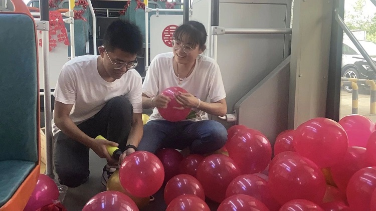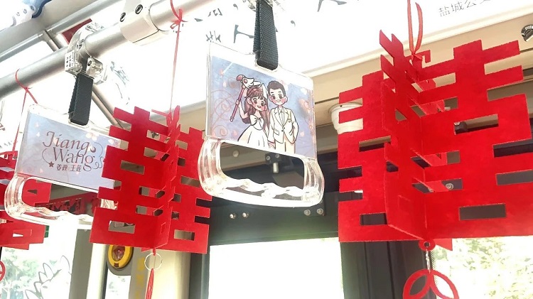 大大的红花、吉祥的囍字、鲜艳的气球,浪漫的婚纱照……一对新人亲手布置的“爱情专列”里外都透着浓浓的甜蜜气息。